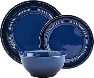 Mason Craft & More フェスティバルディナーウェアコレクション - ラウンド耐久性ストーンウェア 大胆でカラフルなオンブレグレーズプレートボウル 12ピースフェスティバルディナーウェアセット ディープブルー