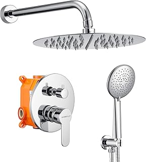 HIMK シャワーシステム 壁掛けシャワー蛇口セット バスルーム用 高圧10インチ レインシャワーヘッド 3段階設定手持ちシャワーヘッドセット 圧力バランスバルブ トリムと切替弁付き ポリッシュクローム